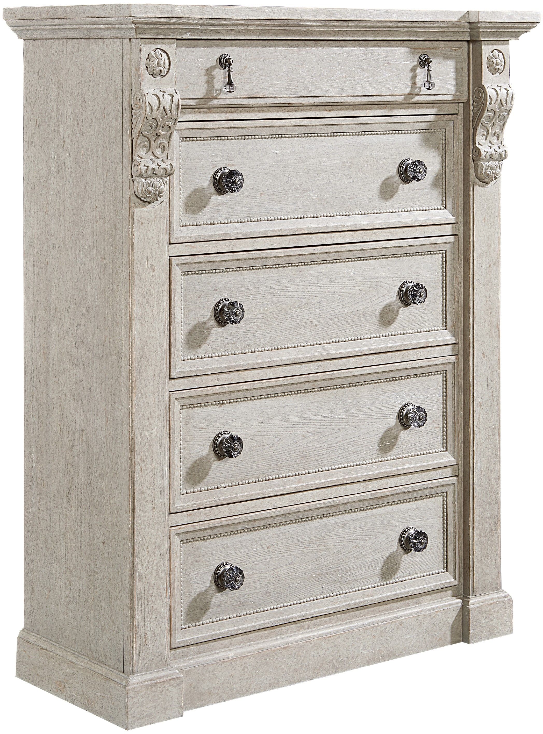 The sturdy side posts and carved corbels on the five-drawer Jackson Drawer Chest were inspired by stone fireplace; the chest is further embellished with smoked glass drawer hardware. The Jackson Drawer Chest is constructed of parawood solids and cathedral elm veneers, and is available in Parch, a light open-grained finish, or Mist, a neutral aged gray paint.