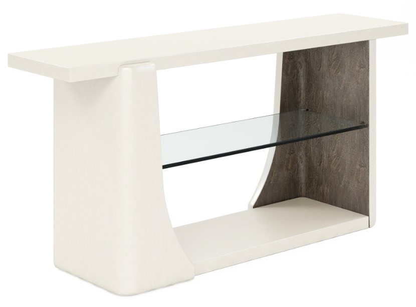 This stylish console combines eye-catching form with practical function. Clean lines and solid wood construction are beautifully highlighted by a warm alabaster finish, with subtly curving sides that reveal a burnished bronze, gesso patterned interior with a uniquely patterned surface. A lower glass shelf provides additional space for decor items and accessories.Read More