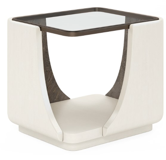 The rounded square glass top of this end table offers a view into its intriguing interior. A unique gesso inner surface finished in burnished bronze is enclosed by an exterior with a plaster-smooth warm alabaster hue. This high contrast accent piece adds a dash of drama to any living space.Read More