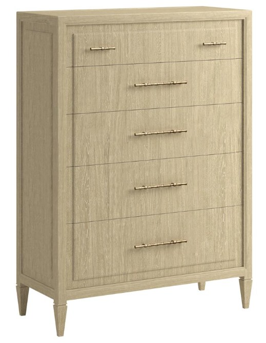 The drawers are accented with unique, elongated hardware that adds a touch of textural interest and visual appeal. The chest's design is further enhanced by its gently paneled drawer fronts and sides, creating a sense of depth and architectural detail. The piece rests on elegantly tapered legs, adding a touch of lightness and sophistication to its overall profile. Finished in a light, natural wood, the Eave II Drawer Chest brings a sense of calm and understated luxury to your bedroom or dressing area. A reinvention of 19th-Century English classics infused with Chinoiserie details. Collections features pieces finished in stunning clear quartered walnut veneer, mixed with selected items in Candy Apple Red, Black and Frosted Bronze bridging timeless elegance with modern sofphistication.