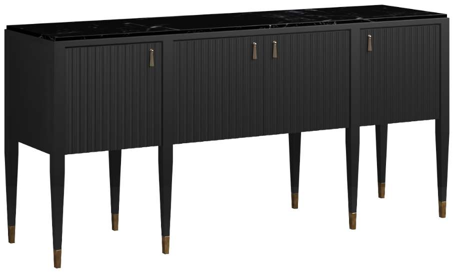 New traditional sideboard in ebony black (ink) finish with four pleated front doors and stylized tassel pulls in burnished gold finish with black mariquine marble top.