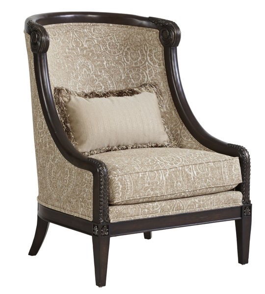 The beautiful carving on the arm supports and scrolled top rail of the Giovanna Azure Carved Wood Accent Chair complements the rich woven pattern of the chair’s upholstery fabric. The chair comes with a kidney pillow trimmed with brush fringe.