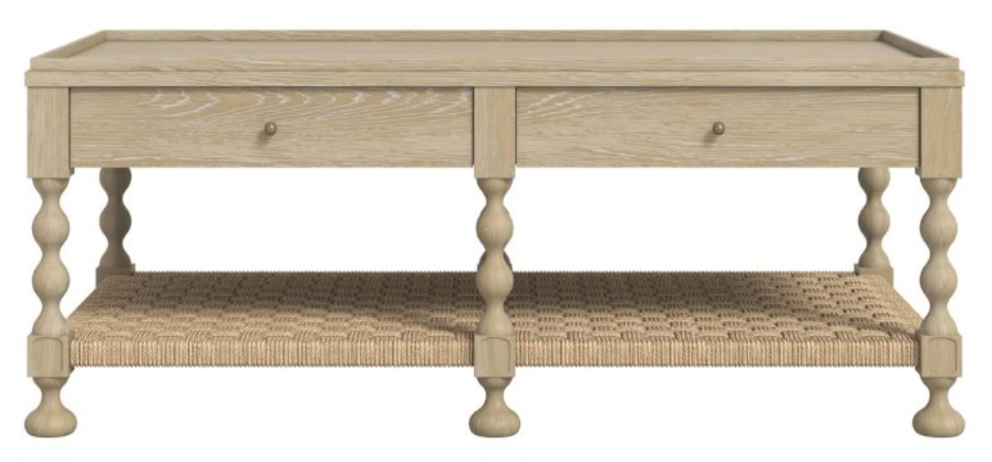 The delicate turned legs add a touch of feminine whimsy, while the woven rattan shelf provides a unique and stylish storage solution. With its two drawers offering concealed storage, this cocktail table seamlessly blends functionality with the lighthearted, inviting atmosphere that defines the Haven collection. Perfect for gathering around with friends and family, this table adds a touch of enchanting style to any living room. Inspired by classic cottage charm, Haven reinterprets traditional design with a whimsical, modern twist. Featuring hand-made detailing, curved legs, and delicate inlays, the collection draws from rural home aesthetics while embracing fresh colors and playful finishes. With simplified geometries and joyful hues inside, Haven blends traditional warmth with contemporary flair, offering a cozy and inviting atmosphere. This collection celebrates the timeless beauty of classic design, infused with a lighthearted, feminine touch that transforms any space into a delightful haven.