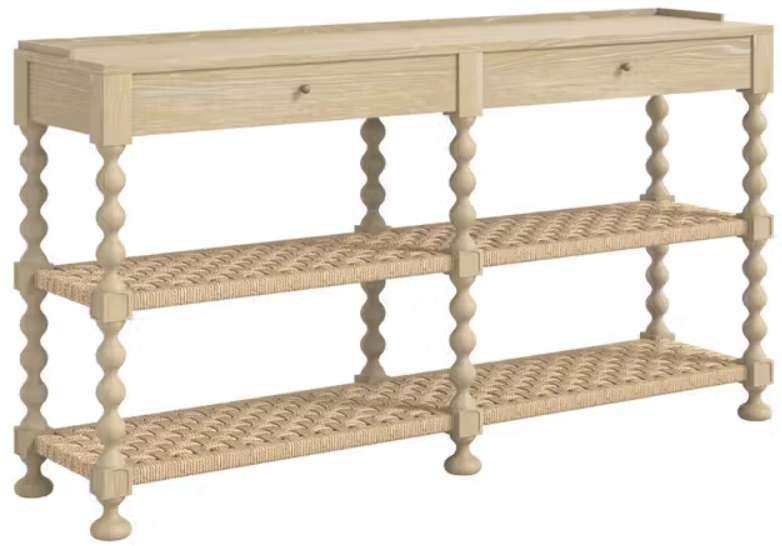 The delicate turned legs add a touch of feminine whimsy, while the woven rattan shelves provide unique and stylish display or storage solutions. With its two drawers offering concealed storage, this console table seamlessly blends functionality with the lighthearted, inviting atmosphere that defines the Haven collection. Perfect for adding a touch of enchanting style to any hallway, living room, or dining area.