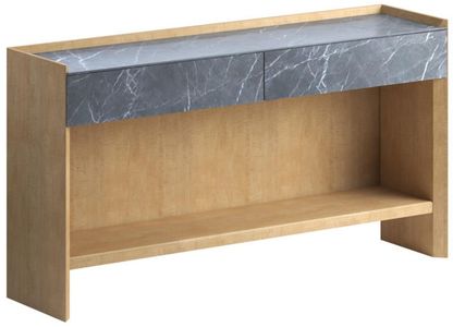 Classic contemporary console table in figured maple with honed marble faced drawers and top as well as fixed shelf below. A Celebration of crisp lines and beveled edges, this collection offers over 20 designs in figured maple veneer, complemented by fabric-wrapped, or organic jute cord accents. Perfect for metro, urban, or contemporary homes.Read More