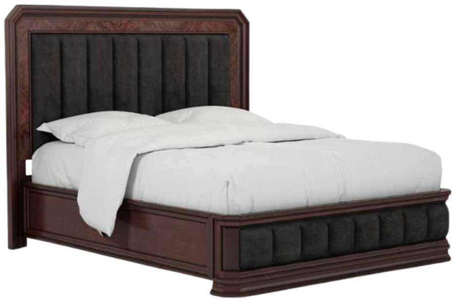 The headboard and footboard of this bed feature sumptuous upholstered channeled panels, upholstered in decadent charcoal velvet fabric. Not only does this provide a plush and inviting feel, but it also adds a touch of opulence to your sleeping space, while the rich Napa Mahogany finish adds warmth and depth to any bedroom décor.