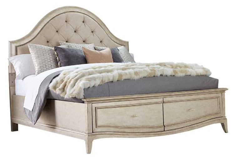 The generously button tufted upholstery of the Starlite California King Upholstered Panel Bed with Storage is framed in an arch of gently curved molding and has two roomy storage drawers in the footboard.Read More