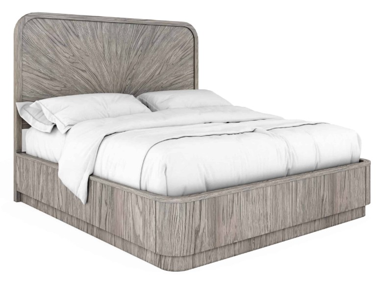 Here comes the sun! This panel bed features a large solid poplar headboard with oak veneer in an eye-catching radiant pattern. A horizontally grained footboard and sides fully encloses the bed in a round-cornered frame in an attractive grey finish.Read More