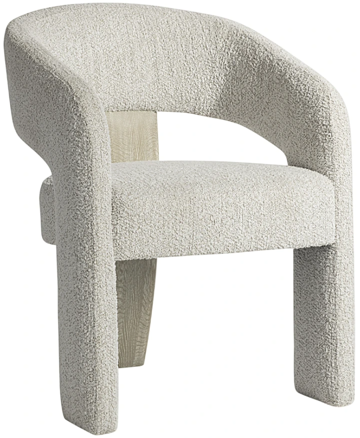 Arcadia arm chair showcases relaxed, modern style, with an open back that curves around to form the front legs. The seat floats in the center, highlighted by a wood panel in Clay finish that crafts a third leg on the back. The wire-brushed wood complements the texture of the fabric.Read More