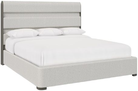 Headboard has alternating upholstered and flat fabric panels in fabric B104 and wood ends and feet in Porcini finish