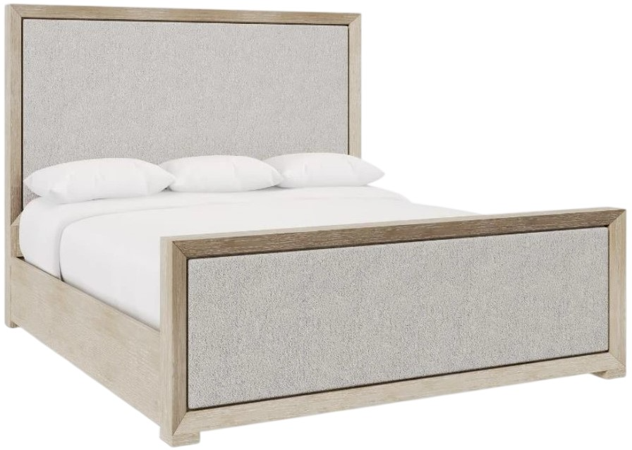 This Prado panel bed has an exposed wood frame in Tawny finish with inset upholstered panels for comfort. The wood side rails connect the headboard to a complementary footboard that also features an upholstered panel.Read More
