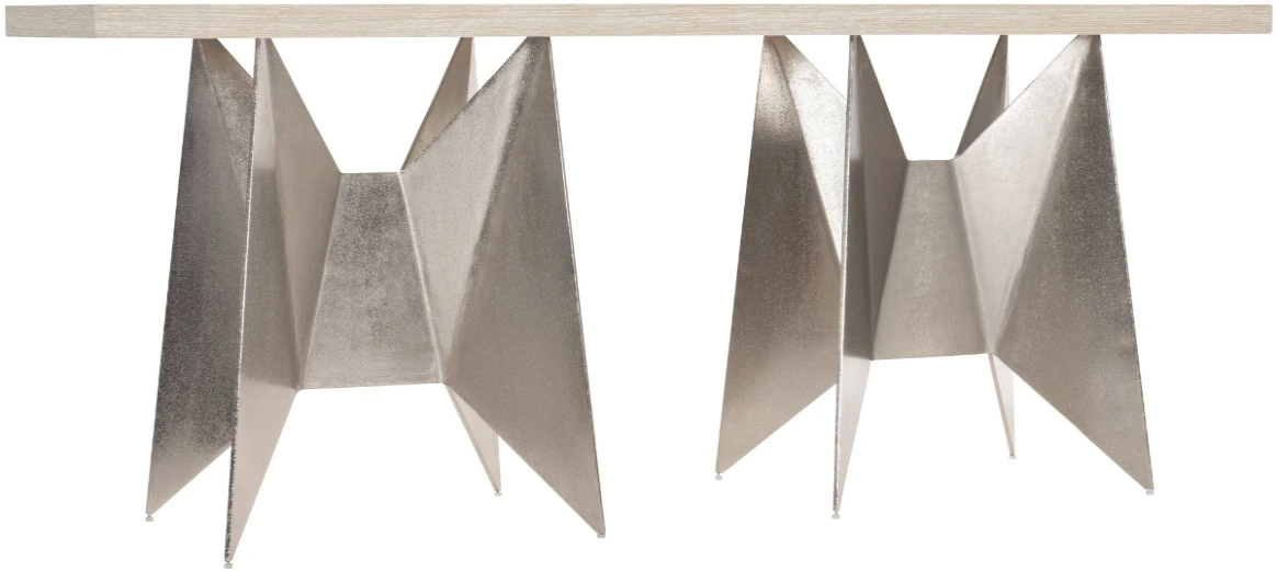 The precise folds of origami are the inspiration for the geometric bases on the Solaria console table. Cast in aluminum with a shiny nickel finish, the stunning supports draw all eyes, while the wood top balances the look with a softened counterpoint, featuring quartered white oak veneers in a Dune finish.