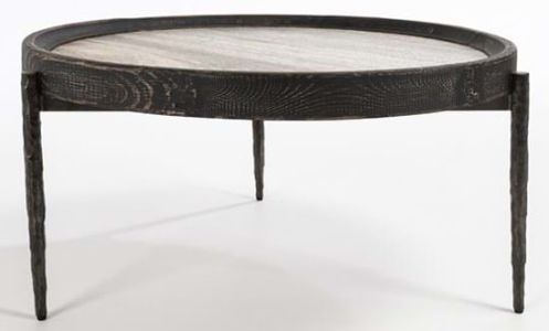 This coffee table features a disc of travertine within a reclaimed wood frame. Hammered metal legs add an industrial element to the look. Showcasing the natural variations and patterns of wood and stone, this piece brings rugged beauty to any space.Read More