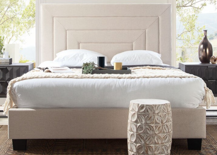 With its square headboard, geometric accent detailing on the headboard and wood feet finished in a rich medium walnut finish providing the backdrop for the light cream polyester finish - timeless sophistication is the result. Bed is available in Queen & eastern King sizes. Foundation or box spring is required.
