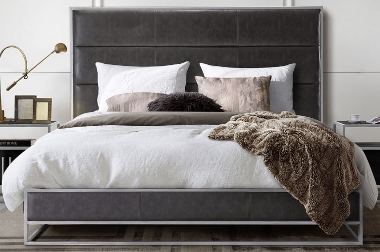 The weathered grey leatherette look provides a material contrast, yet a sophisticated compliment to the bed's overall design by providing a soft, supple addition to the bed's presentation. Metal slats are included, thus requiring a foundation or box spring be used with the mattress. Bed is available in Queen or Eastern King.