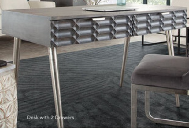 Solid mango wood in smoke grey finish with nickel finished iron legs and drawer pulls provide a chic and sophisticated aesthetic. Petra Collection includes: 2-drawer desk, 1-drawer end table and 2-door upright cabinet.