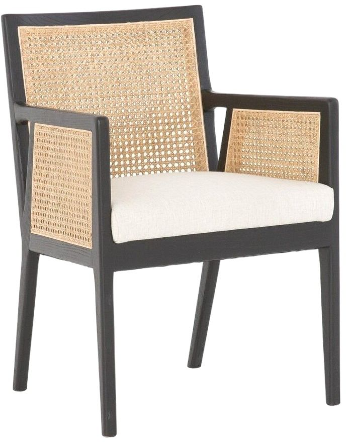 Mixed materials refresh retro dining style. Brushed ebony nettlewood frames a textural inlay of natural cane, for perfect contrast. Neutral linen-blend seating of high-performance fabric for modern sensibility.Read More