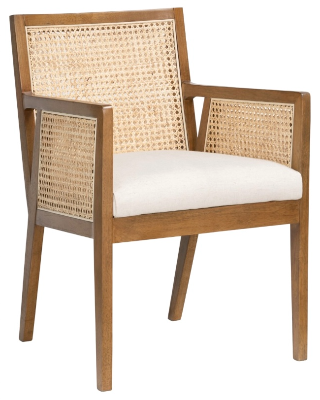 Mixed materials refresh retro seating style. Light-toasted nettlewood frames a textural inlay of natural cane for a clean, monochromatic look. Neutral linen-blend seating of high-performance fabric brings modern sensibility to everyday dining.Read More