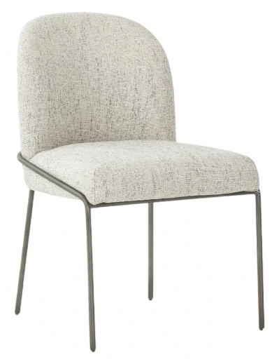An Art Deco dream. Finely sculpted, scalloped-back dining chair of Four Hands-exclusive performance fabric pairs with slim, iron tube framing finished in a brushed slate, for a textural, fashion-forward feel. A dining chair is crafted for both aesthetics and comfort. The shape and styles making them versatile additions to any dining space.Read More