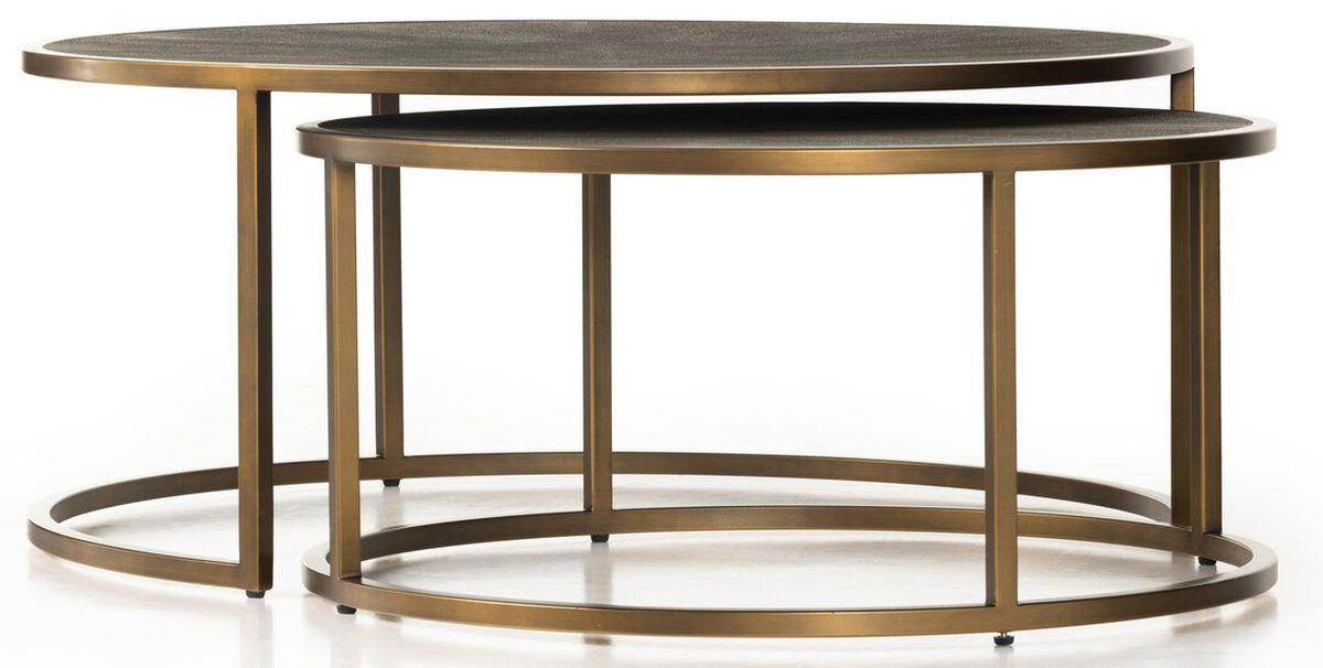 Antique brass-finished iron curves like a crescent to welcome a nesting option for its smaller-scaled companion table. A resin faux shagreen table top in grey lends rich texture to clean, modern lines. Large Table Dims: 38"w x 38"d x 16"h Small Table Dims: 30"w x 30"d x 14"hRead More