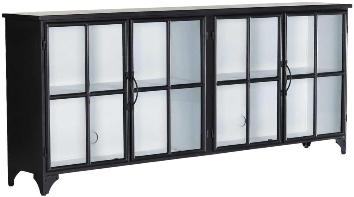 A distressed black iron frame contrasts a clean white interior for an updated take on the traditional media console. Windowpane doors and ample interior shelving maximize storage and display options. Variation from piece to piece is to be expected, and speaks to the natural allure of industrial iron.Read More