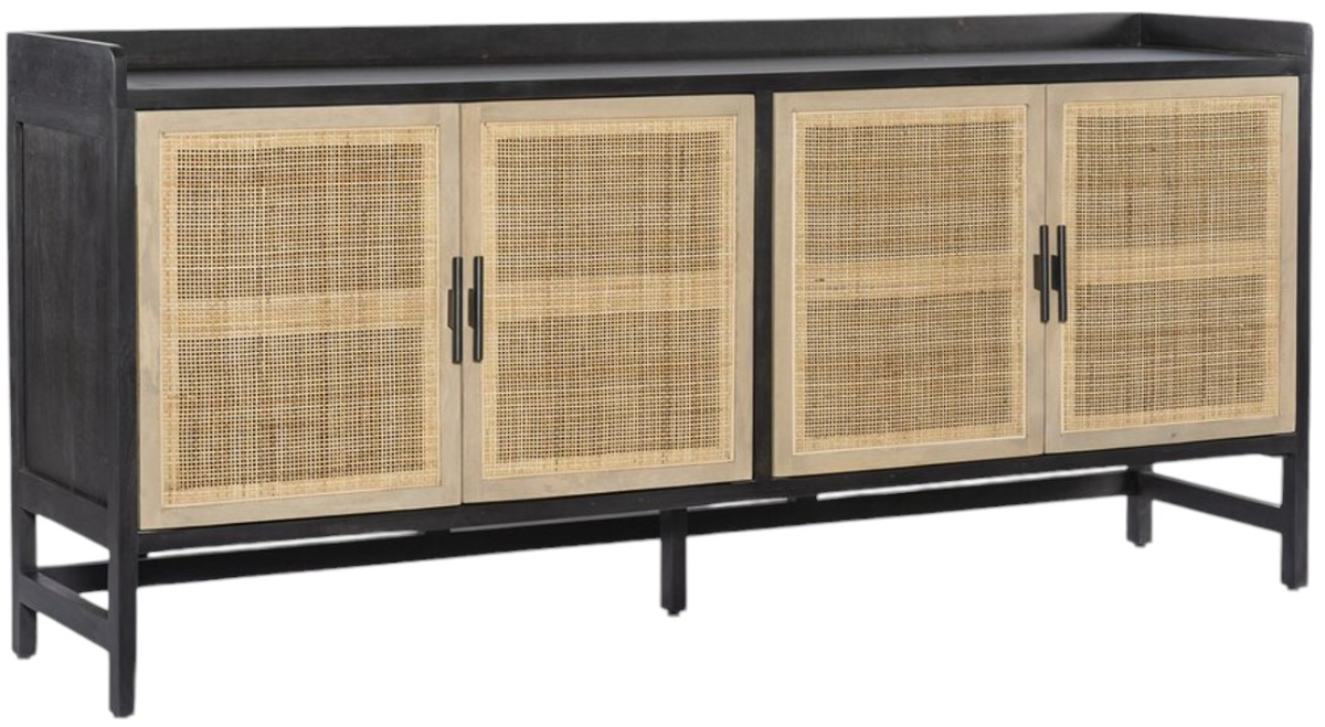 Eye-catching contrast with a textural twist. Black-washed mango frames woven cane fronts with black iron hardware. Inside, spacious shelving awaits storage of dinnerware and more. Rear cutouts for cord managementRead More