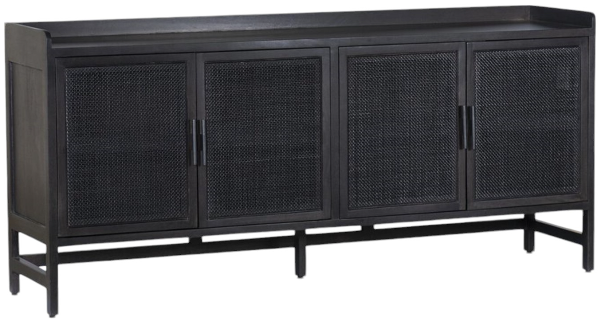 Monochromatic with a textural twist. Black-finished mango frames woven cane fronts, with black iron hardware. Inside, spacious shelving awaits storage of dinnerware and more. This piece is made to be both gorgeous and sturdy. Make a bold statement by incorporating this furniture into your home.Read More