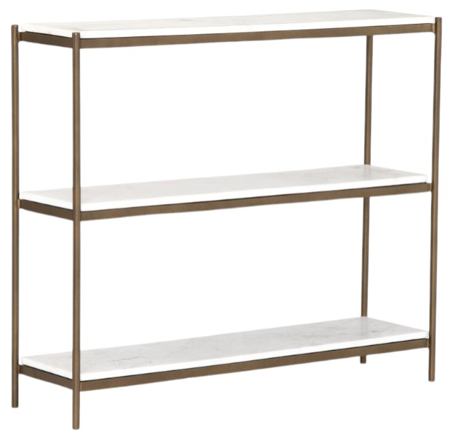 Add a pop of sophistication to any space. Polished white marble lays three tiers of smooth shelving for an open style with plenty of surface area. Antique brass framing places a feminine spin on console storage.Read More