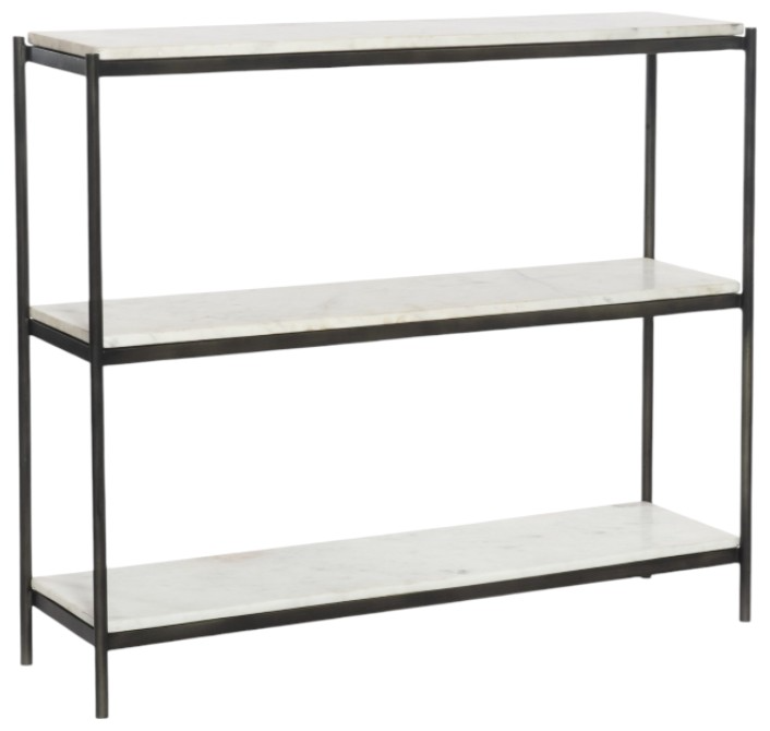 Add a pop of sophistication to any space. Polished white marble lays three tiers of smooth shelving for an open style with plenty of surface area. Hammered gray framing places a feminine-industrial spin on console storage.Read More