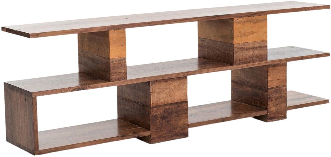 An Asian-inspired, open design effortlessly mixes materials, weights, and placements to achieve an arresting balance. Solid walnut and reclaimed peroba woods. This piece is designed in collaboration with Thomas Bina. This piece will make a bold statement to your living room.Read More