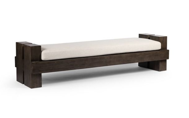 Twin pillar legs flank the soft seat of this accent bench