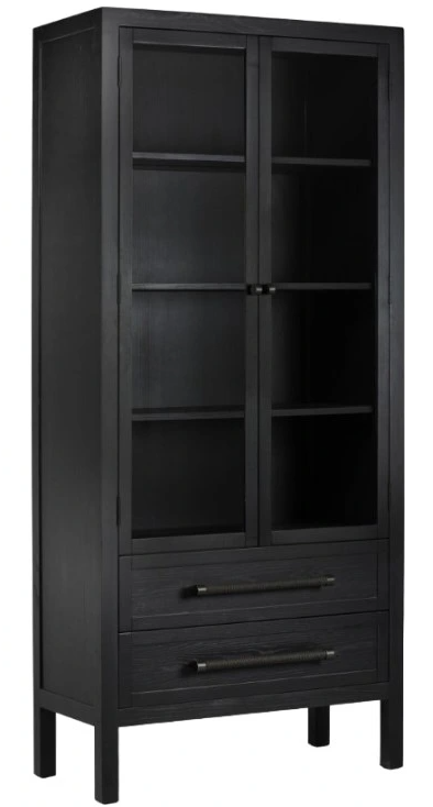 Black oak forms stately cabinetry, with glass-front doors that open to generous storage and display space. Linear handles are wrapped in paper cord for a textural touch. Its durable construction ensures lasting appeal.Read More