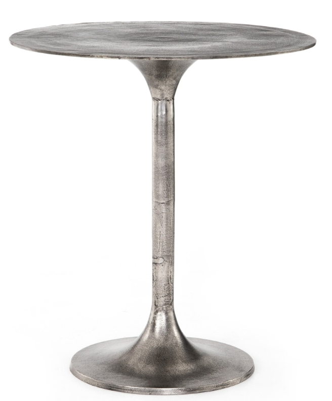 Classic tulip shaping in textural cast-aluminum makes for a modern counter table. Finished in a raw antique nickel to bring out alluring highs and lows, indoors or out. Cover or store inside during inclement weather and when not in use.Read More