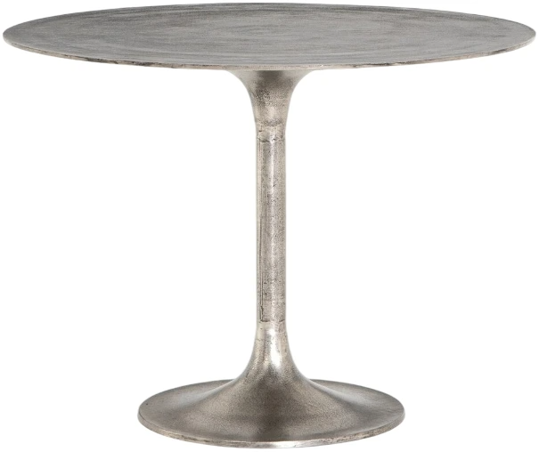 Classic tulip shaping in textural cast-aluminum makes for a modern bistro table. Finished in raw nickel to bring out alluring highs and lows, indoors or out. Cover or store inside during inclement weather and when not in use.Read More
