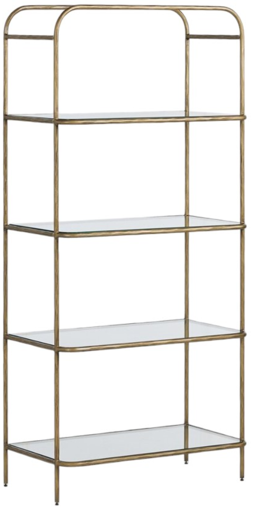 Hammered aged brass with curved corners frames tempered glass shelving, for a transitional look with subtle vintage vibes. This piece is made to be both gorgeous and sturdy. Make a bold statement by incorporating this furniture into your home.Read More