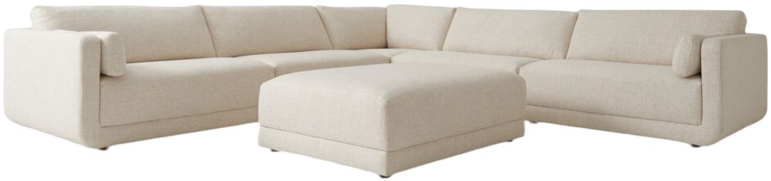 An elevated take on the modular sectional. This new collection features clean lines with loose back and arm cushions. A smooth linear base is fully upholstered and wraps up the arms for a shelter effect. Covered in a new basketweave cream fabric that brings comfort to the entire piece.Read More