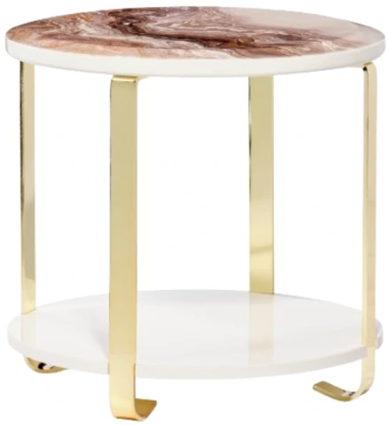 Positioned perfectly between your sofa and loveseat, the Ariana End Table adds an extra touch of sophistication. Its slender gold legs and faux marble top embody chic style, while the handy bottom shelf blends functionality with panache.Read More