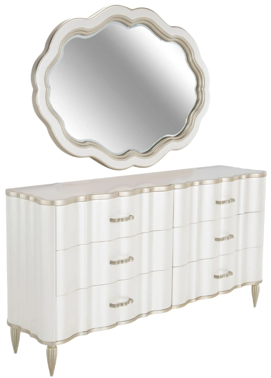 Design with glamour. The London Place creamy pearl dresser and mirror brings a romantic shine and polished elegance to any room, with six full-size velvet-lined drawers with self closing glides and a gleaming marble top. Mirror frame features a creamy pearl finish with platinum accents.Read More