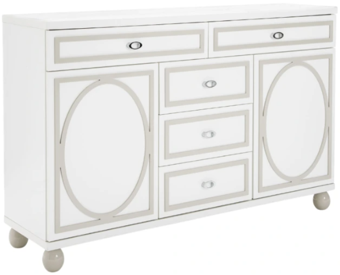 Dresser features five drawers and two cabinets, with a hidden jewelry drawer and a lift-out tray behind the left door