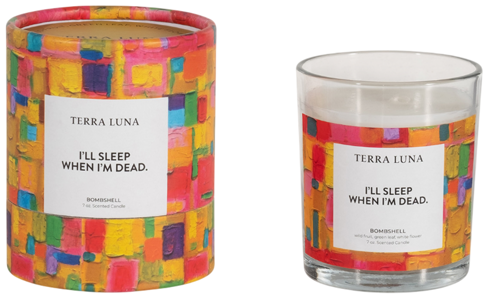 A bold glass candle featuring the cheeky “Sleep When Dead” phrase and vibrant multi-color hues. Poured with fragrant Bombshell-scented wax, it’s packaged in a matching box. Compact yet eye-catching, it adds personality and playful aroma to desktops, shelves, or as a fun gift accent.Read More