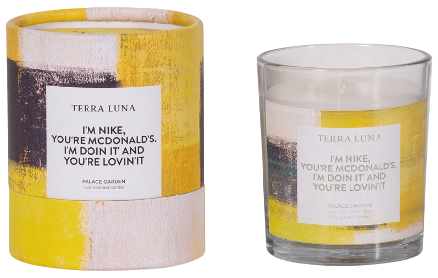 White glass candle with “Doin It And Lovin It” text