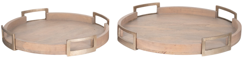 The Sagebrook Home Maxwell 2-Piece natural round tray set includes two generously sized natural-finish round trays. Crafted from wood with sleek metal accents and supported on subtle feet, they blend rustic warmth with modern style. Perfect for serving drinks, corralling decor, or anchoring a stylish vignette.Read More