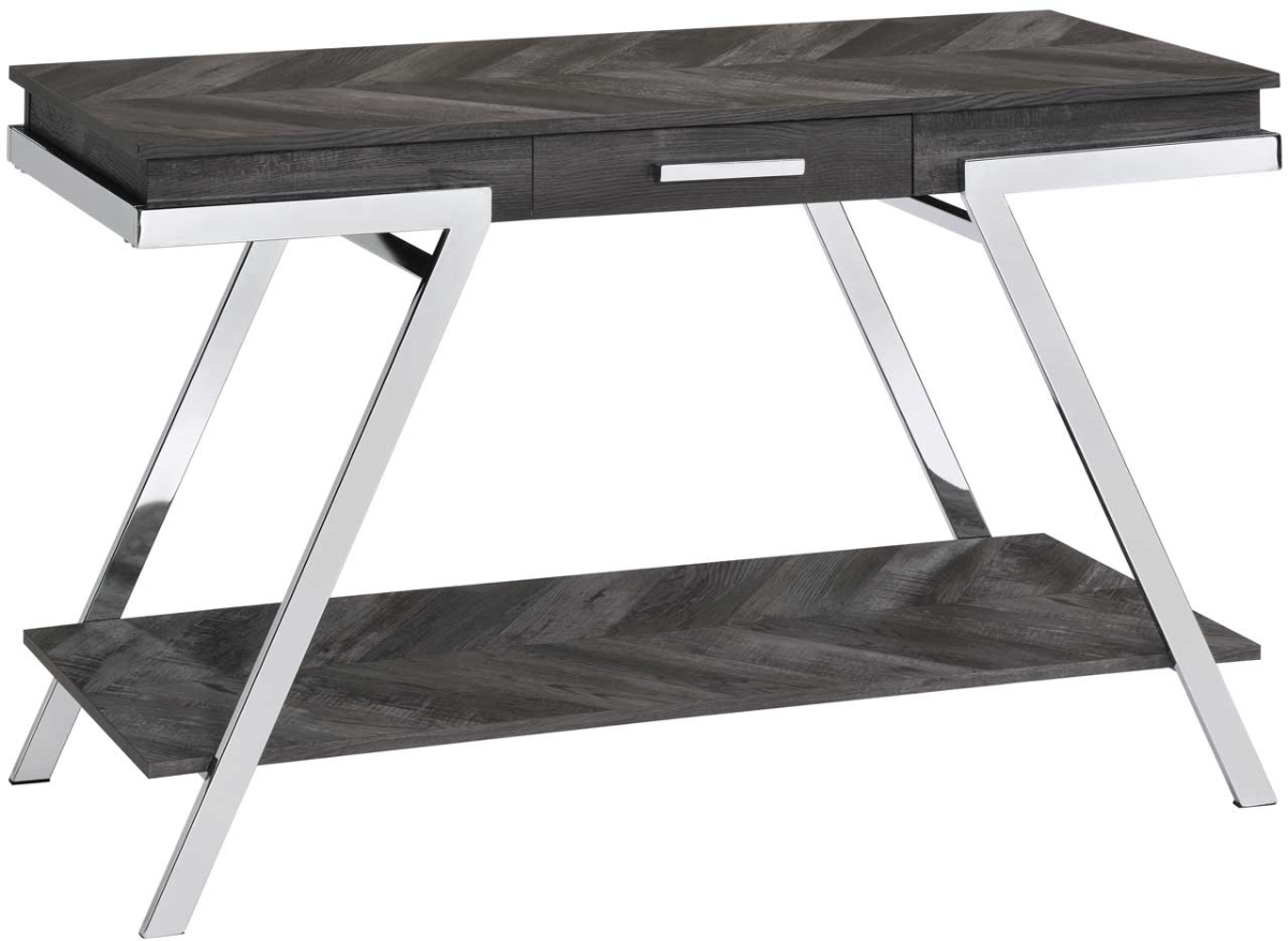 Styling details include rustic appearance combined with canted chrome legs, simulated chevron veneer pattern