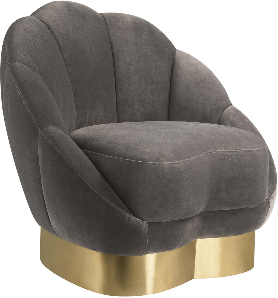 Modern Glam is epitomized in the soft curves and bold design of the Bloom chair by TOV. Boasting posh velvet upholstery, a curved gold base and channel tufting, this chair is sure to dazzle. Available in several soft color options.