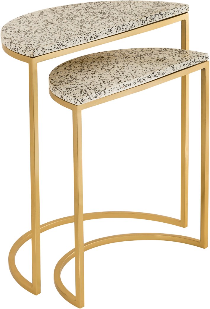 Simply elegant, the Crete tables boast a gold finished half-moon frame topped with stunning, speckled terrazzo. Use them together or separately to easily enhance your space.