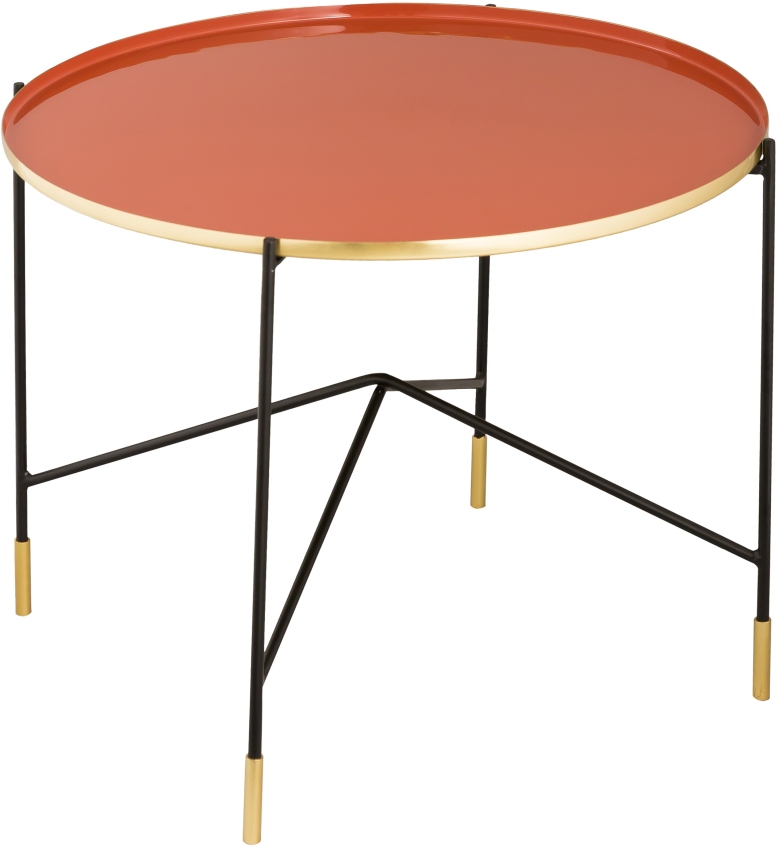Flaunting a stylish angular base, salmon colored enamel top and brass accents, this petite cocktail table will add a playful element of design and color to your space.