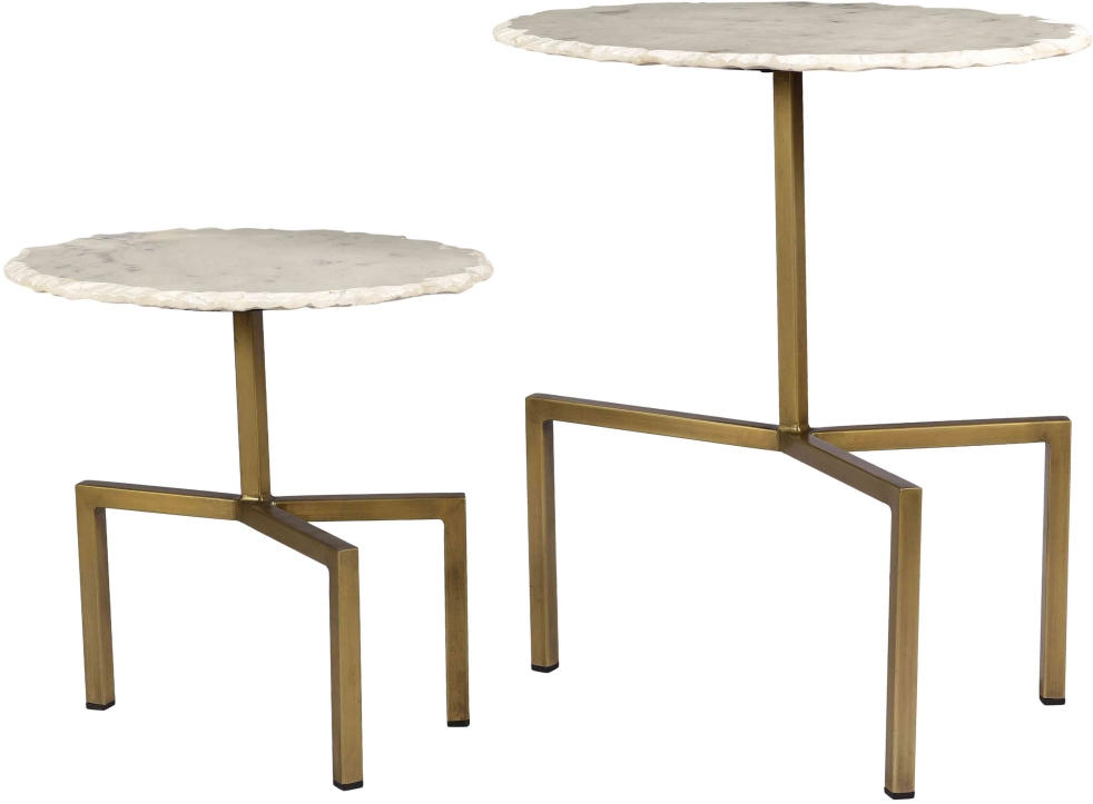 Live edged white marble is supported by an angular brass base. The staggered heights of this table set comlement each other beautifully and will be sure to enhance your space whether used together or separately.