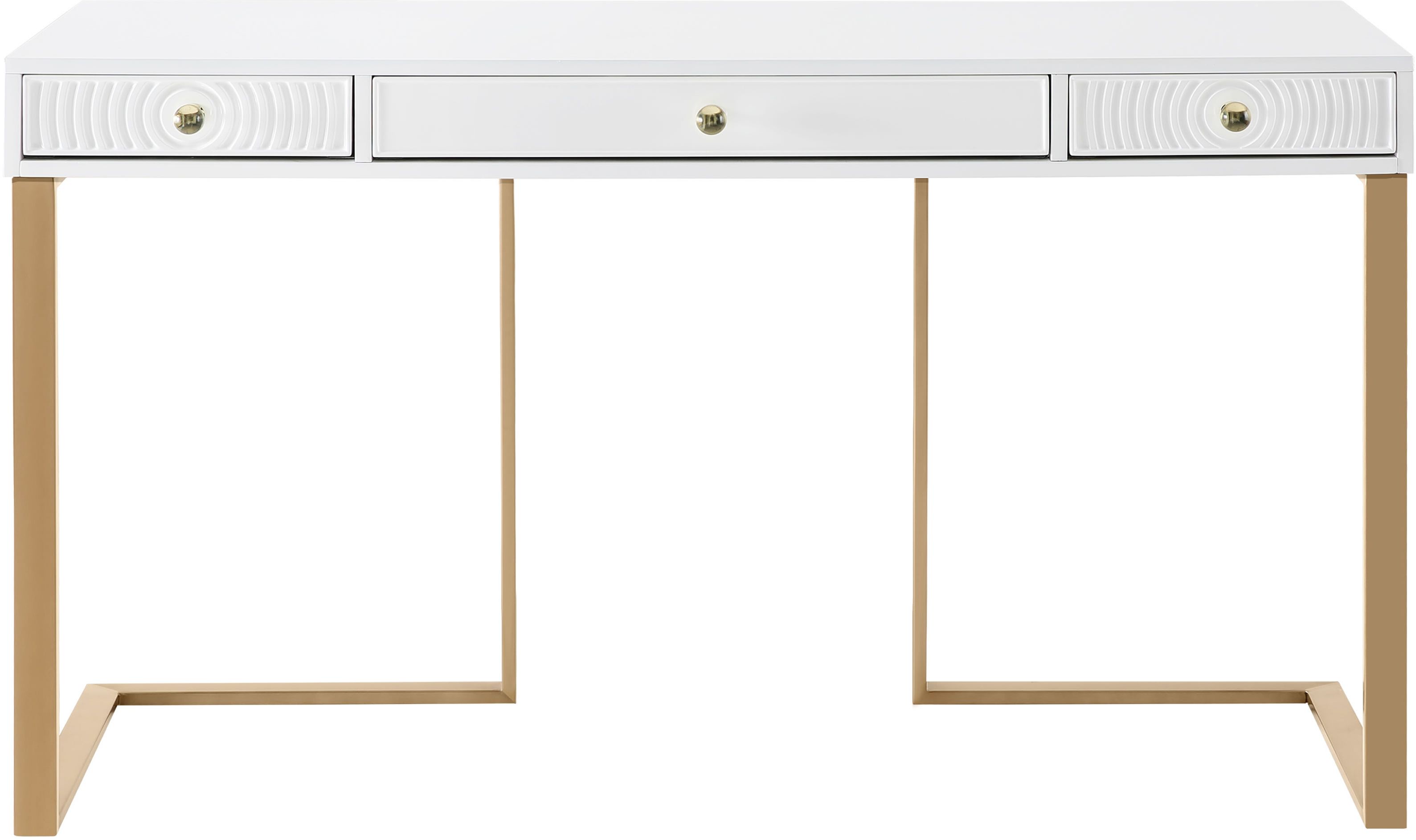 The Janie desk is fashionable for your office. With three convenient drawers, staying organized is super simple. Featuring a lacquered wooden top, clear acrylic handles and a geometric gold base your workspace will be as trendy as you are.