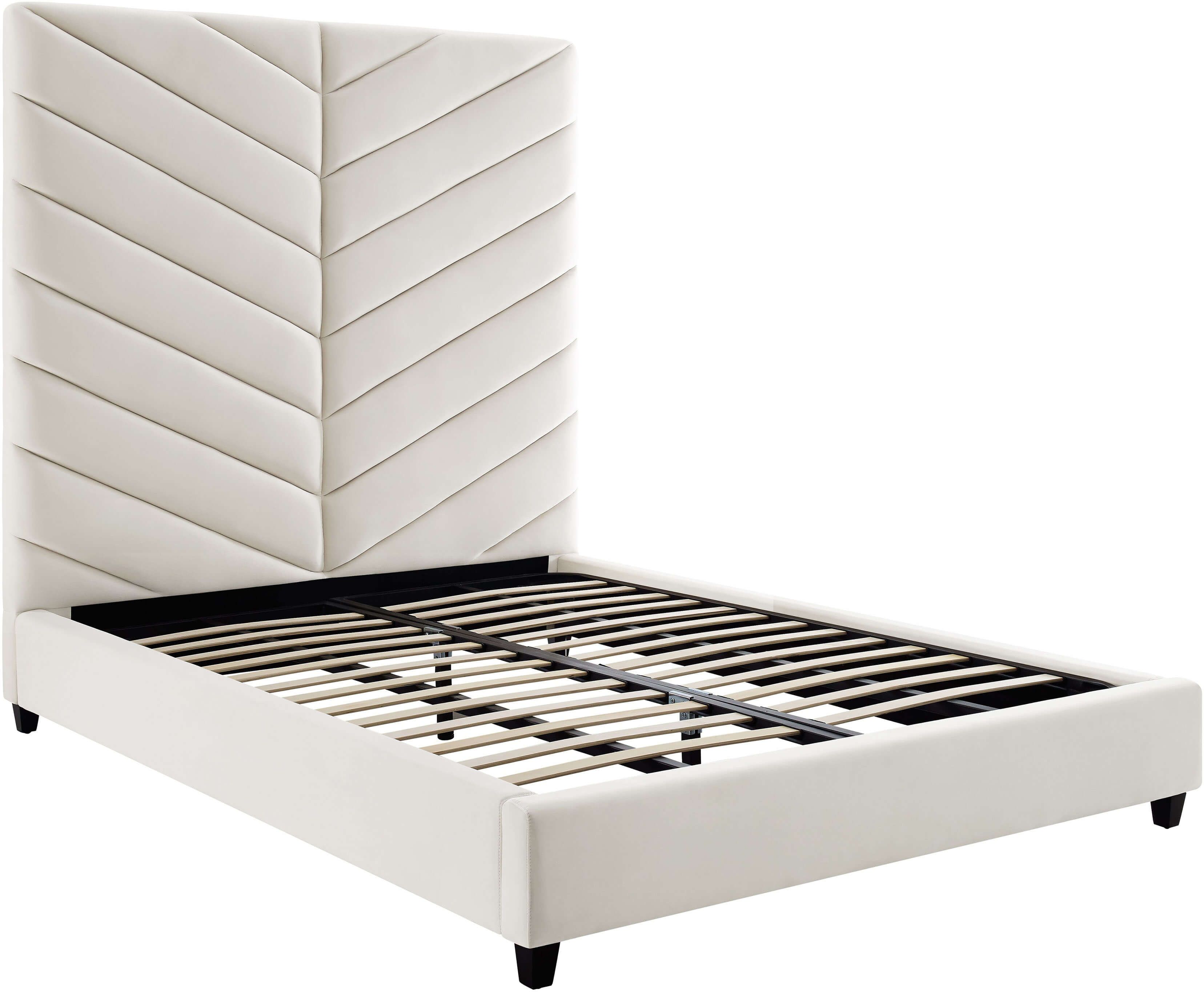 At once subtle and dramatic, the Javan bed invites you to spend the night in style. Upholstered in plush velvet with a channel-tufted design, it's available in King or Queen sizes and multiple colors. Slats are included and box spring is not required.