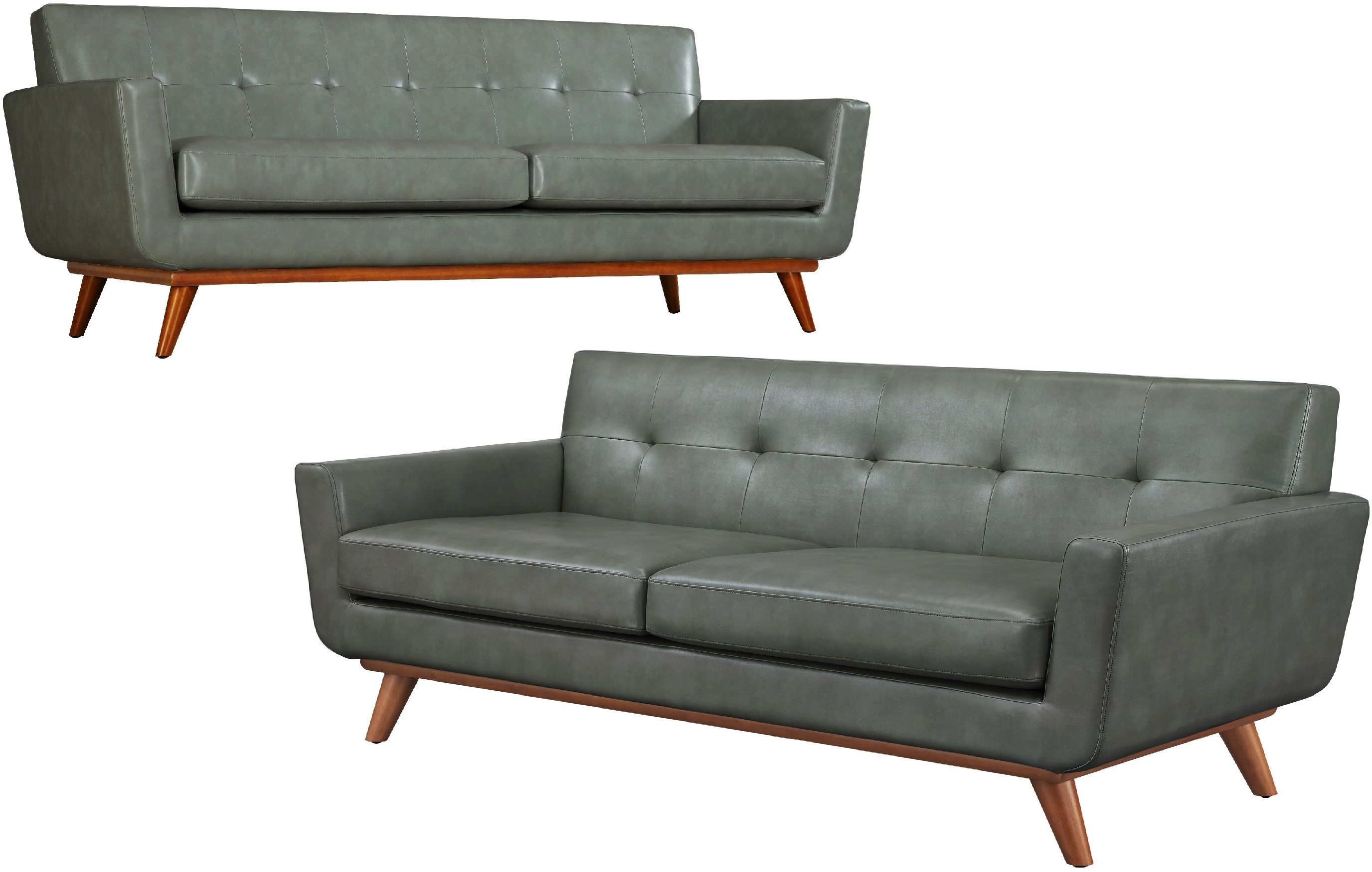 The Lyon loveseat and sofa captures the essence of Mid-Century style that refuses to fade into obscurity. The gorgeous smoke grey Vegan Leather is welcoming and adds charm to any room. The cushioned arms provide added comfort, while the small scale tufting adds a pop of personality. Handcrafted the Lyon collection will undoubtedly add style to your space, while the kiln-dried solid wood frame will assure years of support and comfort.